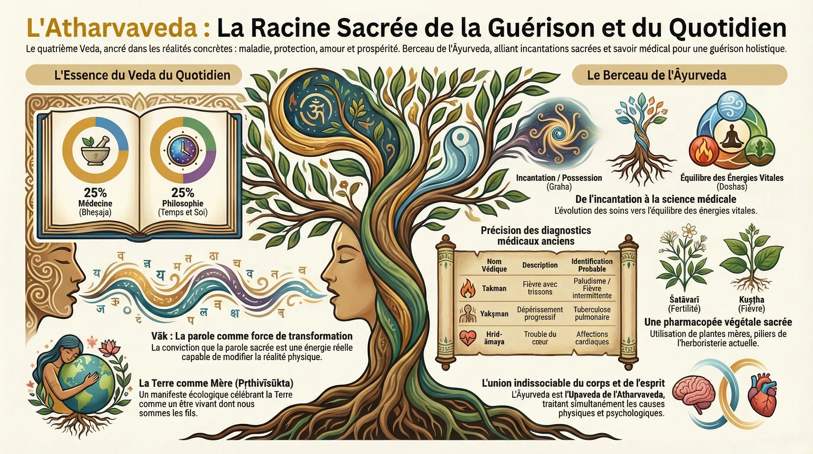 L'approche atharvaṇique — traiter simultanément le corps, le mental et l'environnement ; combiner plantes, rituel et parole — préfigure la médecine intégrative contemporaine qui cherche à réunir ce que la modernité a séparé.
