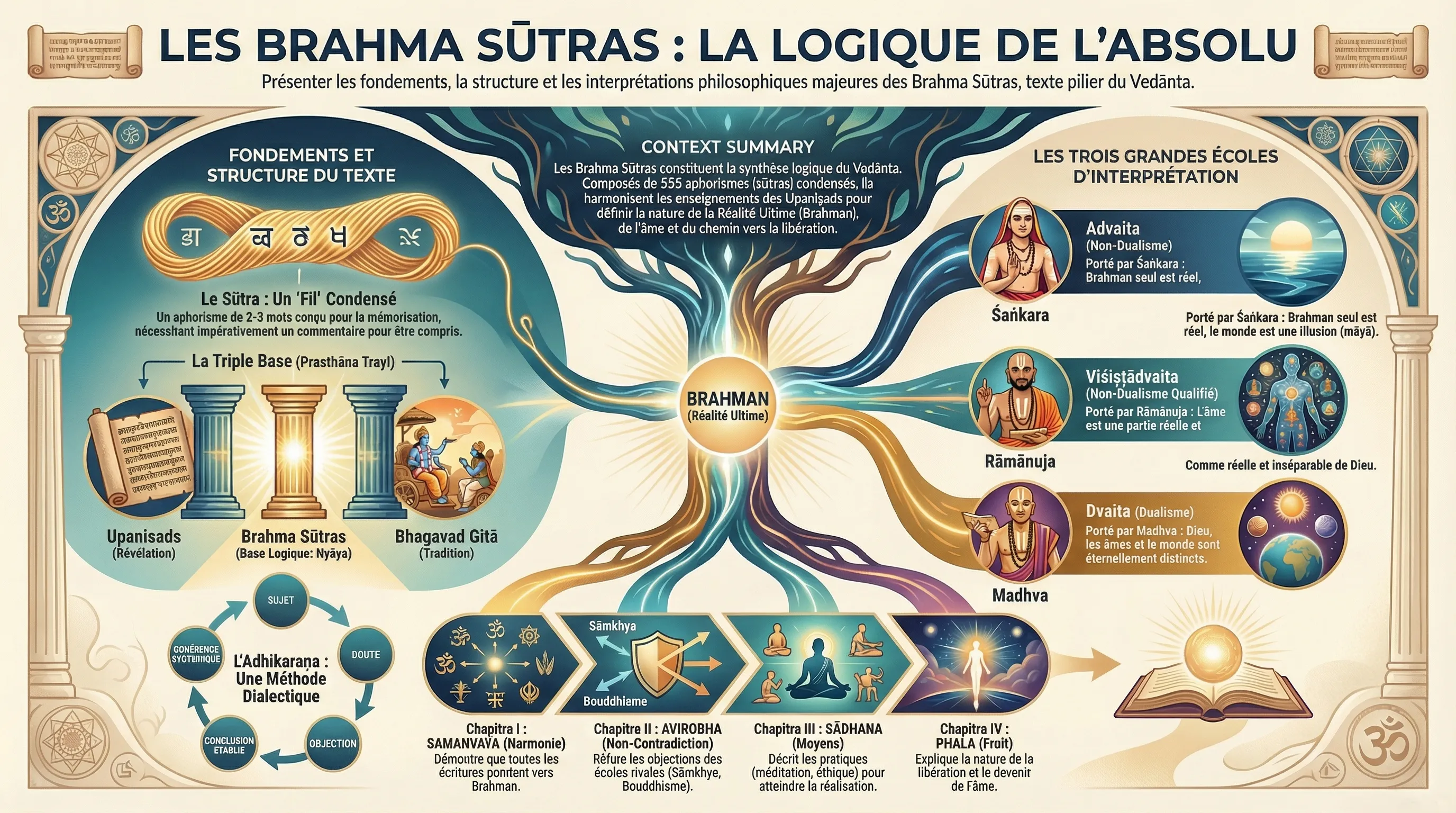 Si les Upanishads offrent l'expérience directe du Réel et la Bhagavad Gita fournit des enseignements pratiques, les Brahma Sutras apportent la structure logique et l'interprétation systématique qui unifie ces enseignements en une philosophie cohérente.