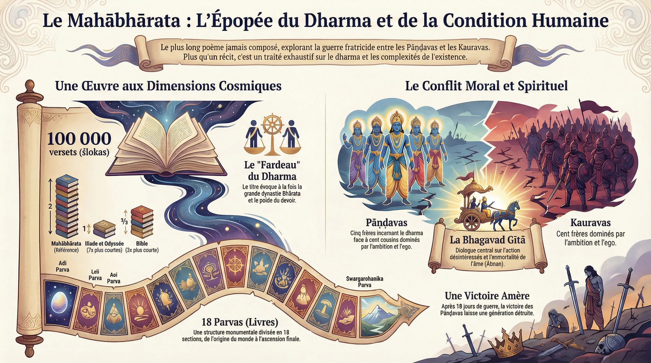 Le Mahabharata (महाभारत) est bien plus qu'une épopée : c'est une encyclopédie vivante de la culture indienne, un monument littéraire sans équivalent dans l'histoire de l'humanité. Composé de environ 110 000 vers (shlokas) répartis en 18 livres (parvas), il est sept fois plus long que l'Iliade et l'Odyssée réunies.