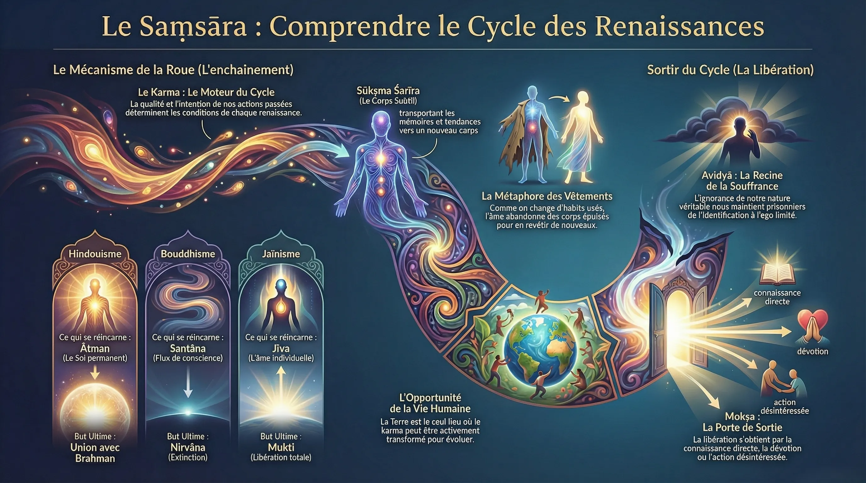 | Hindouisme | Saṃsāra | Ātman / Jīva (le Soi individuel) | Mokṣa — union avec Brahman |