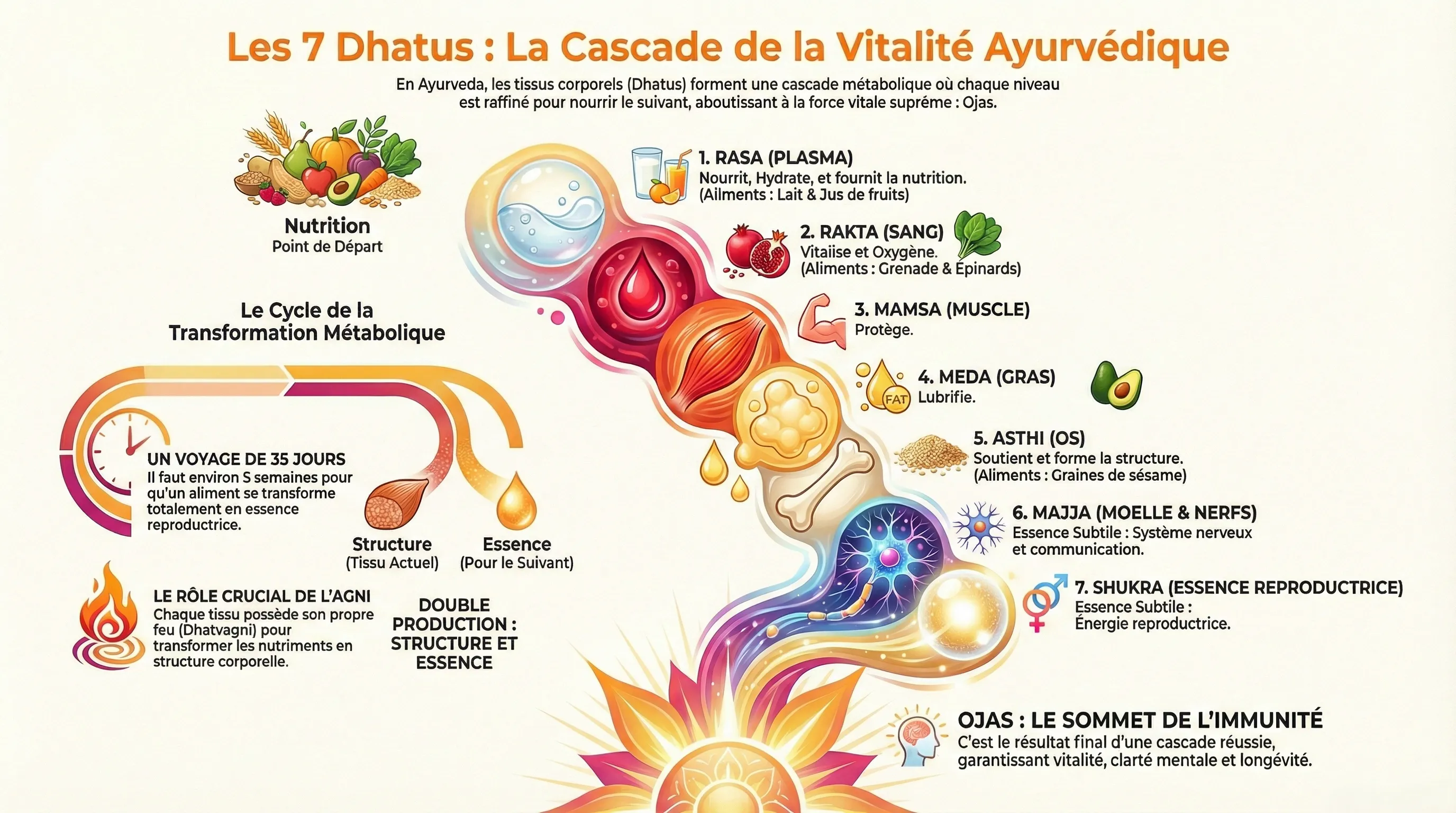 Lecture estimée : 50-65 minutes — De Rasa (plasma) à Ojas (essence vitale)