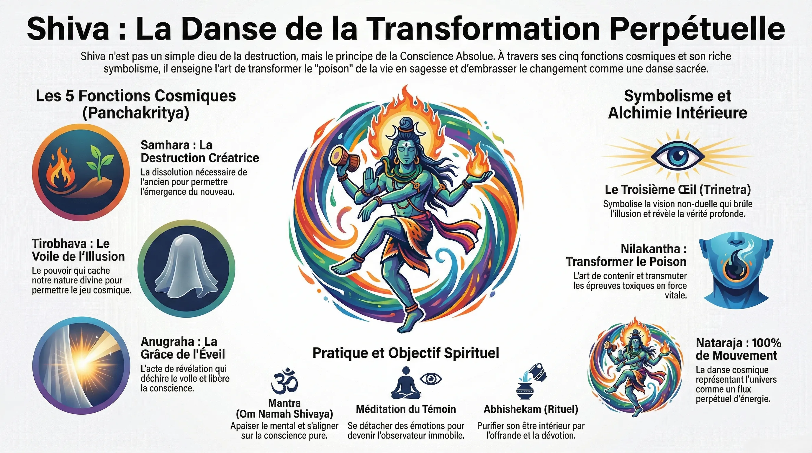 Shiva (शिव), dont le nom signifie « l'Auspicieux », « le Bienveillant » ou « le Pur », est l'une des divinités majeures de l'hindouisme. Il incarne le principe de destruction créatrice, la transformation radicale et la transcendance ultime. Contrairement à une compréhension superficielle qui le réduirait à un « dieu de la destruction », Shiva représente bien plus : il est le feu alchimique qui consume l'ancien pour permettre l'émergence du nouveau.